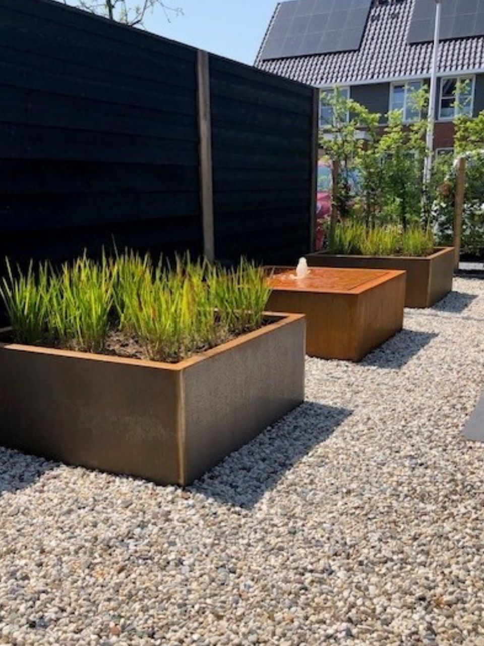 - Les tables d'eau et les bords de bassin en acier corten donnent un aspect moderne.
