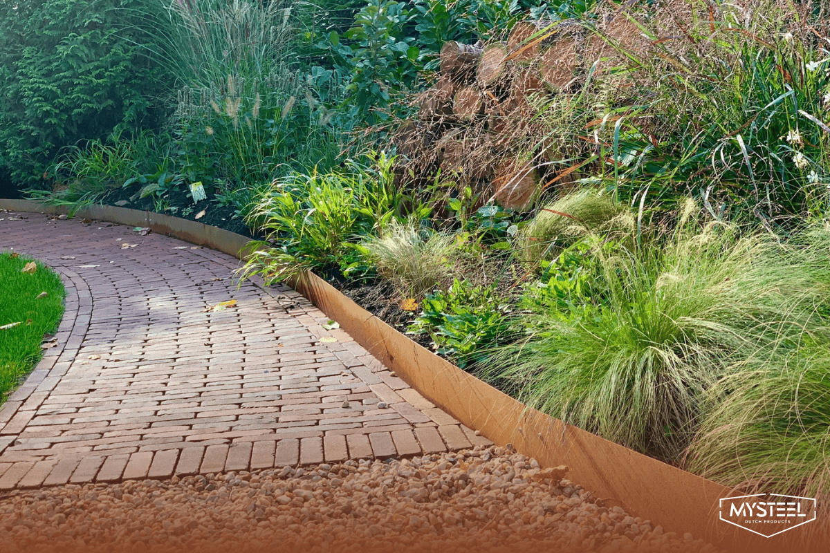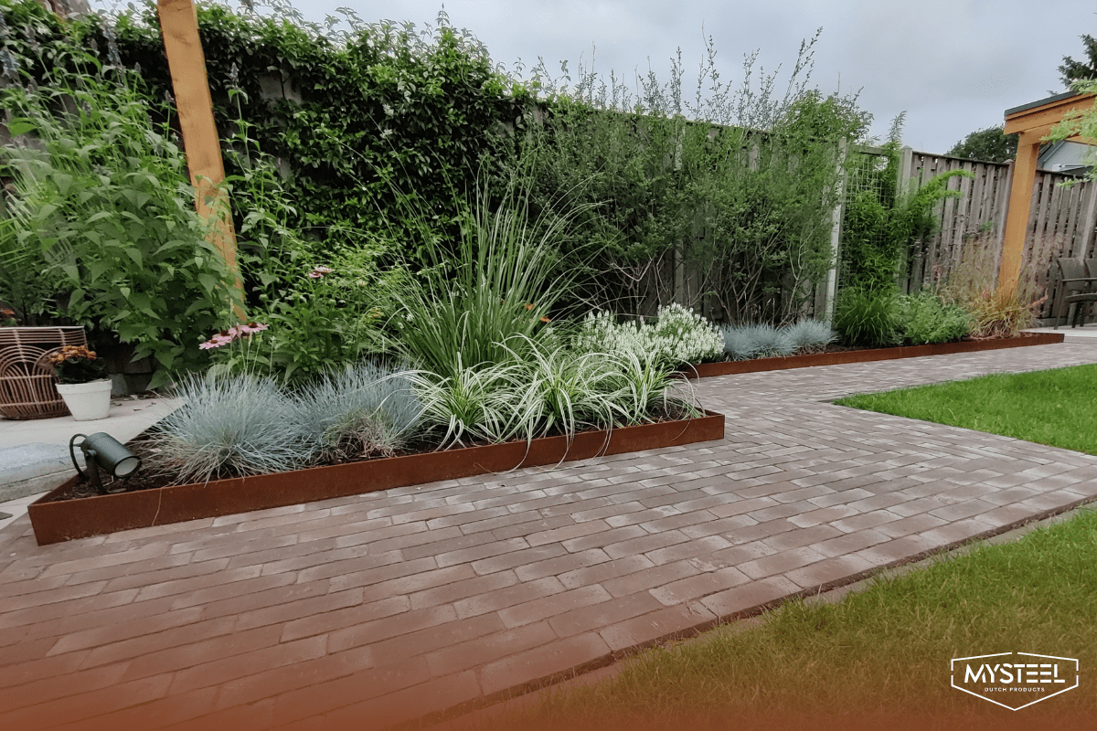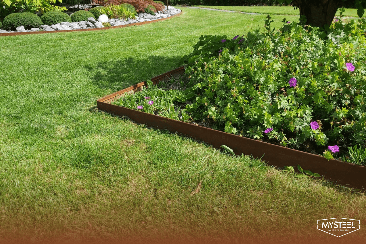 - Bordures en acier corten. Ce matériau est un choix populaire en raison de son aspect rouillé naturel. Après un certain temps, l'acier corten développe une belle patine qui donne au jardin un charme rustique.