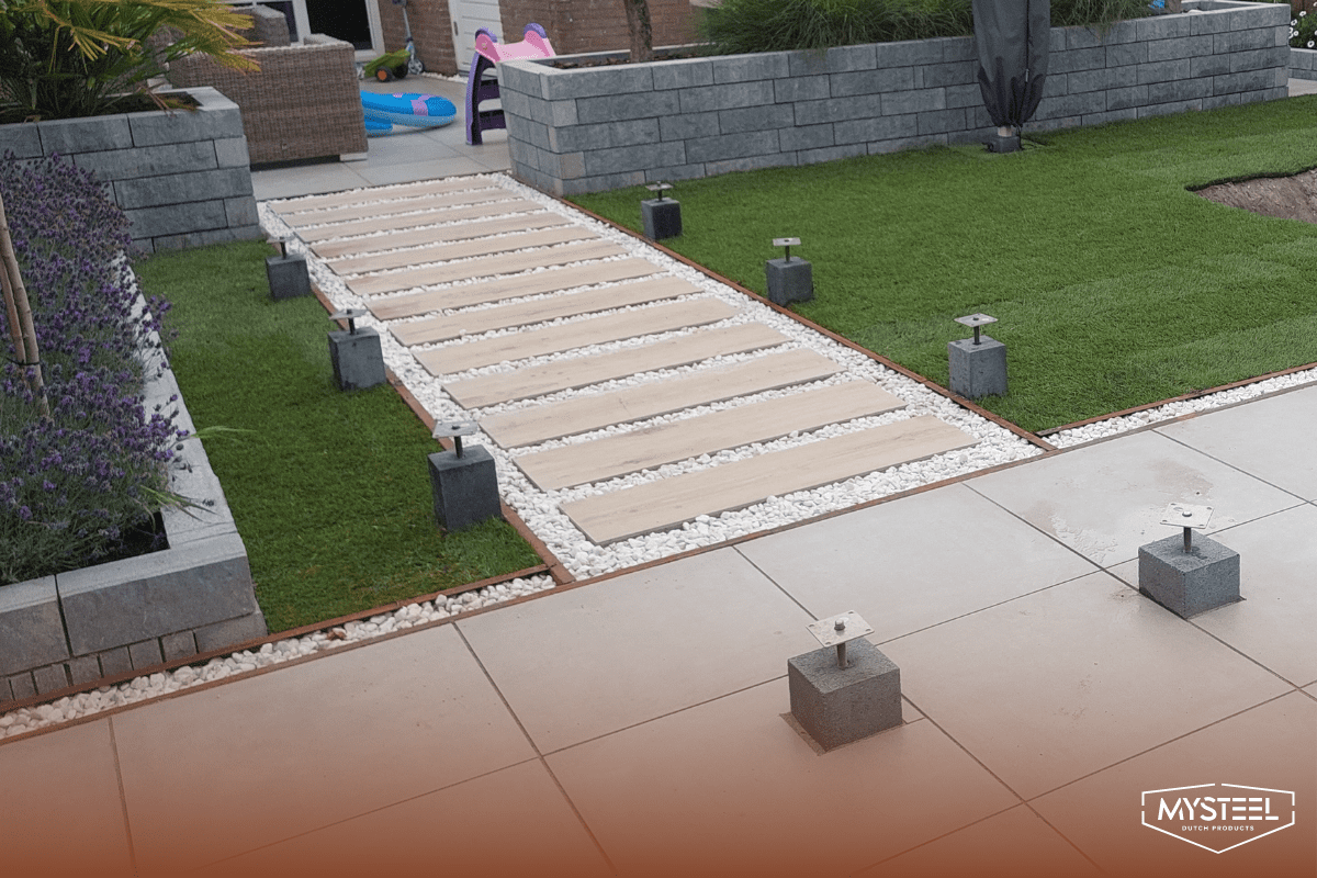 - Visuellement attrayant : Avec une bordure, vous accentuez le chemin de gravier. Si vous choisissez une bordure en acier corten, le chemin aura un aspect chaleureux et naturel et créera un contraste intéressant avec le blanc du gravier.
