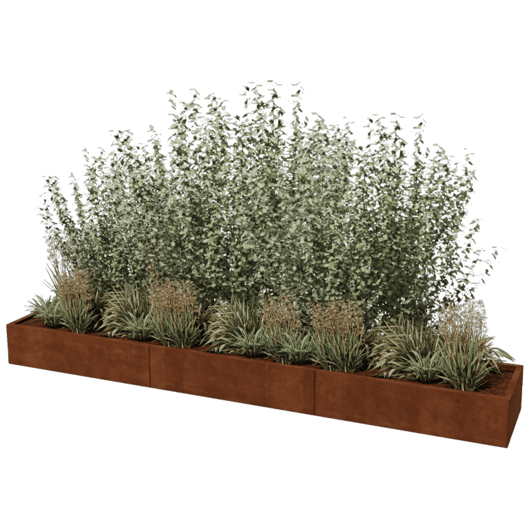 Cette jardinière est une jardinière modulaire en acier livrée en kit. La jardinière est construite à partir de panneaux individuels et de pièces d'angle. Les jardinières peuvent être assemblées de manière totalement invisible. Aucune fixation n'est visible. Grâce à notre système modulaire, de très grandes dimensions sont également possibles. L'utilisation de pièces d'angle permet d'obtenir des formes uniques qui ne sont disponibles nulle part ailleurs en standard. Voir le manuel pour plus d'informations.