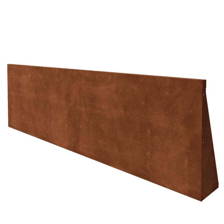 Les murs de soutènement sont fabriqués en tôle d'acier Corten-A de haute qualité. Ce type de métal a la propriété unique de former une peau d'oxyde très dense (couche de rouille). La rouille ne peut donc pas traverser le métal. La couche d'oxyde dense protège le matériau en profondeur de l'oxygène, ce qui ralentit considérablement l'oxydation, tandis que la corrosion se poursuit. Les murs de soutènement sont livrés sans rouille, dans la couleur gris métallisé. Le processus de rouille commence dans les deux premiers mois ; aucun traitement n'est nécessaire. Pendant le processus de rouille, les murs de soutènement peuvent se décoller. L'acier corten est un alliage métallique composé de fer auquel ont été ajoutés du cuivre, du phosphore, du silicium, du nickel et du chrome.